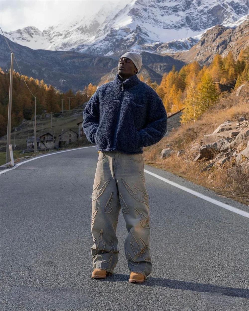 국경을 넘나 드는 미국식 하이 스트리트 패션 브랜드는 복고풍 고민 분위기 청바지 남자의 느슨한 스트레이트 드롭 긴 바지를 찢었습니다.